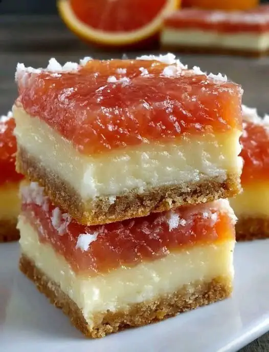 These grapefruit bars are a refreshing twist on classic citrus desserts. They feature a rich, buttery shortbread crust topped with a smooth, creamy grapefruit curd filling. The flavor is perfectly balanced—sweet, tangy, and slightly bitter from the fresh grapefruit. With their beautiful pink hue and soft texture, these bars are both eye-catching and delicious, making them perfect for any occasion or afternoon treat.